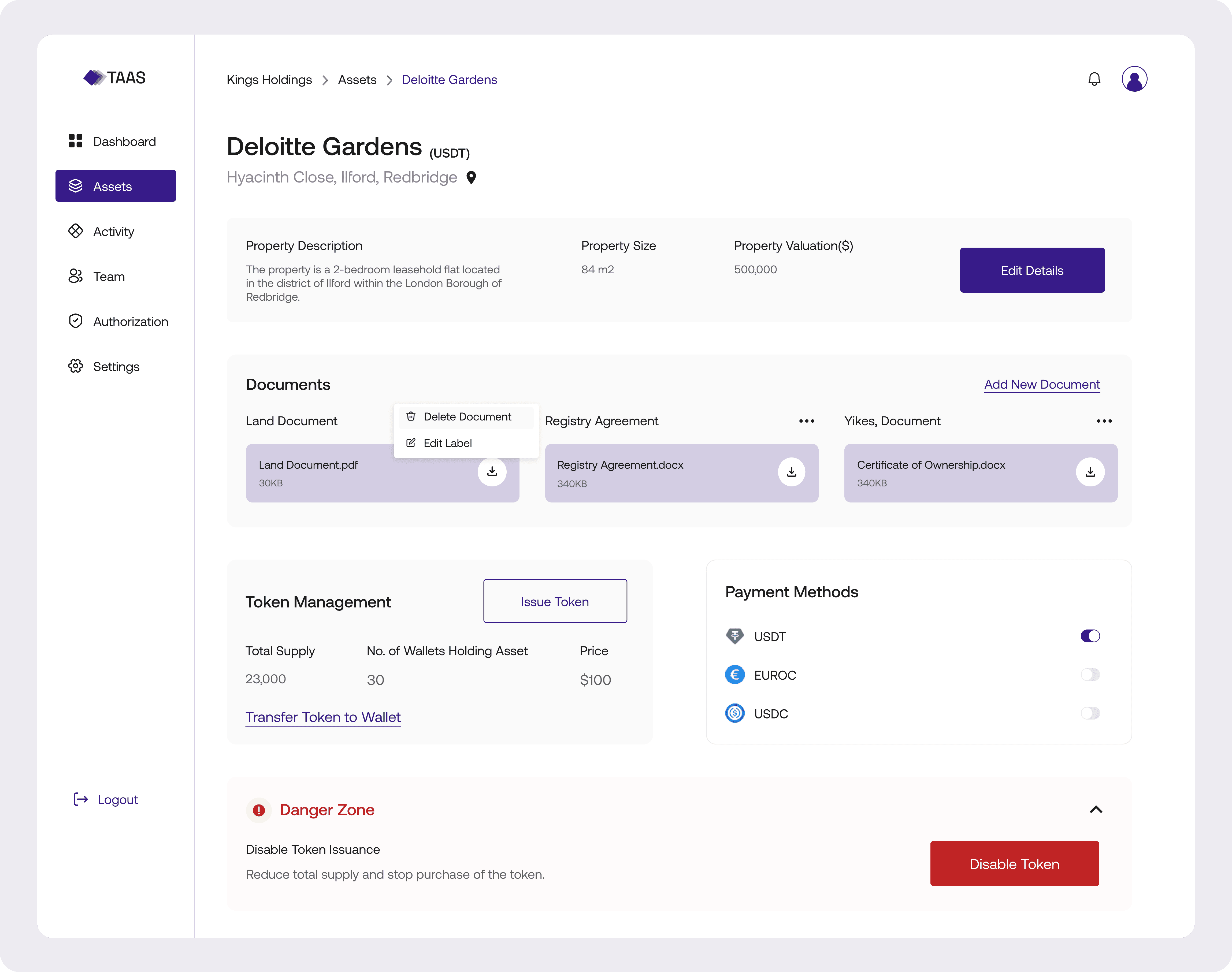 The asset management page highlights details about the particular, sectioning them into Property Information, Documents, and Token Information.