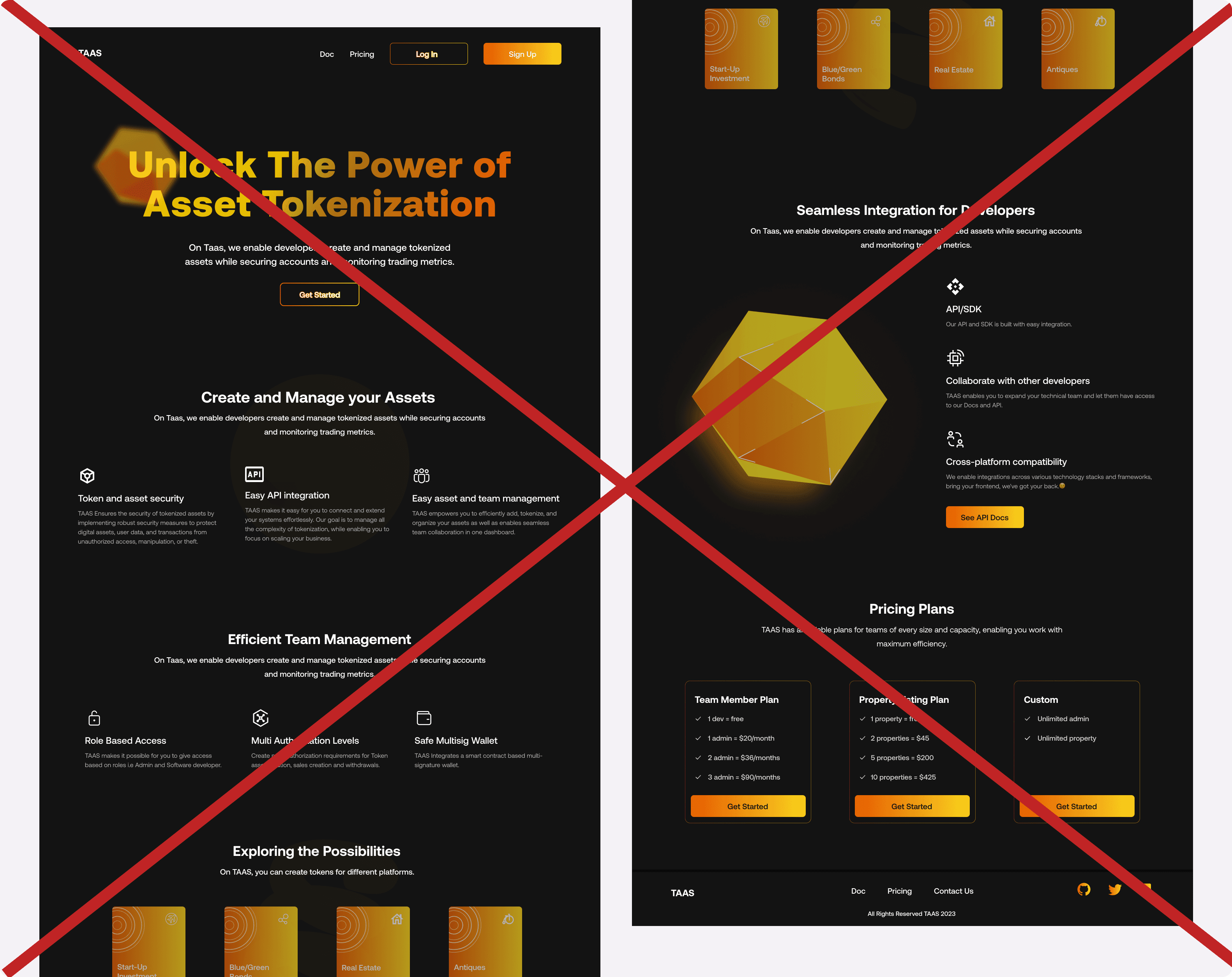 Originally, we decided to use a dark background for TAAS, because we thought it would work better for our target audience; Web3 folks. This led us to the following designs: